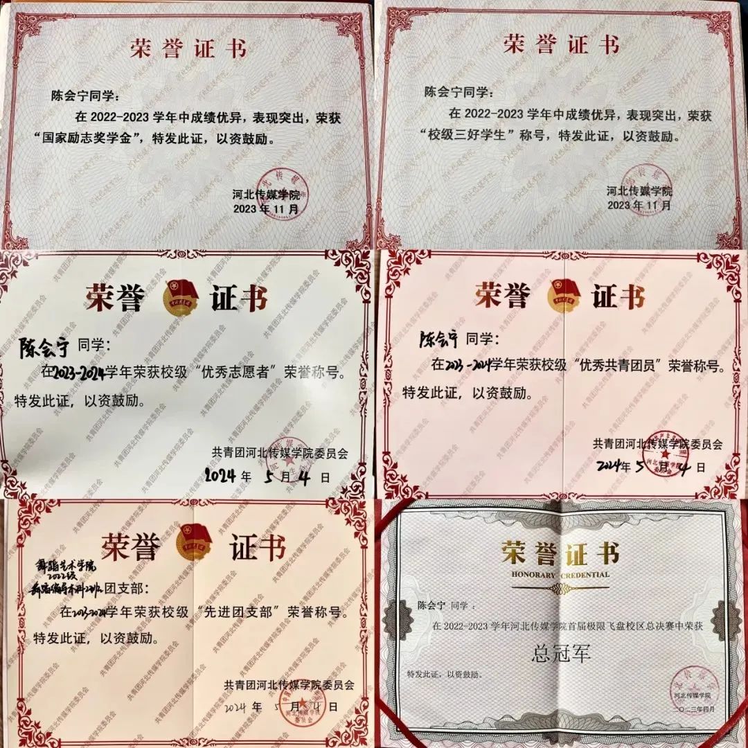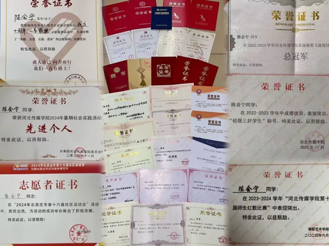 在专业领域,陈会宁也屡获佳绩。她在河北省大学生艺术活动、华北五省市(区)舞蹈大赛等赛事中,凭借《芯种》《舞奕》等作品多次斩获一、二等奖;在河北传媒学院“舞魂杯”、红歌比赛等校内竞赛中表现突出。此外,她还在极限飞盘、演讲、征文等领域取得优异成绩。其参演的舞蹈影像《时光裂缝》更在纽约国际电影奖、柏林独立电影节等国际舞台上揽获重要奖项,展现出跨领域的卓越才能。陈会宁以卓越的艺术表现力与创新精神,展现出新时代青年的多元风采与专业实力。