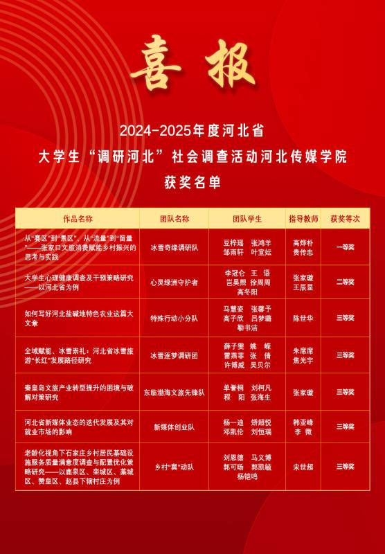 “调研河北”活动是引导我校广大青年学生深入理解省情民情、服务经济社会发展的重要平台。自活动通知发布以来,我校师生积极响应、踊跃参与,全校共申报课题47项。此次成绩的取得,是我校持续深化创新创业教育改革、注重培养学生实践能力和创新精神的集中体现,校团委将继续为广大同学搭建成长平台,助力同学们投身社会调研,用脚步丈量燕赵大地,用智慧服务河北发展,为谱写中国式现代化建设河北篇章贡献青春力量!